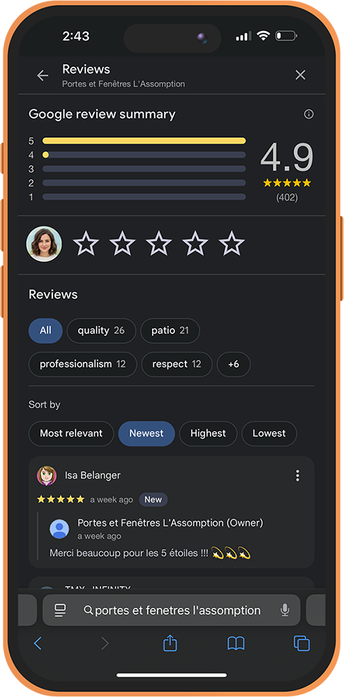 Gagnez la confiance des clients potentiels avec votre assistant IA personnel et établissez-vous comme chef de file dans votre industrie via des avis 5 étoiles sur Google, Trustpilot, etc.